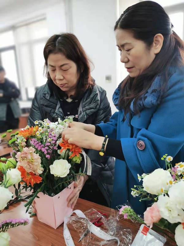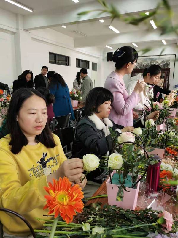 活动开始前,学院书记张向东同志做开场讲话,指出此次花艺沙龙活动既丰富了女教职工的文化生活,提高了大家的艺术修养,又增强了学院的凝聚力。随后,工会主席董永生同志向在座的女教职工致以节日的问候和美好的祝福。活动一开始,经验丰富的花艺师向大家介绍各种花艺知识,并现场示范如何插花。大家兴趣浓厚,对鲜花的品类特性、插花的技巧、作品的保养等知识充满了好奇。经过一个小时的亲身体验,一篮篮色彩绚丽、错落有致、赏心悦目的作品纷纷展现在大家眼前。
