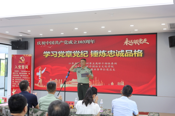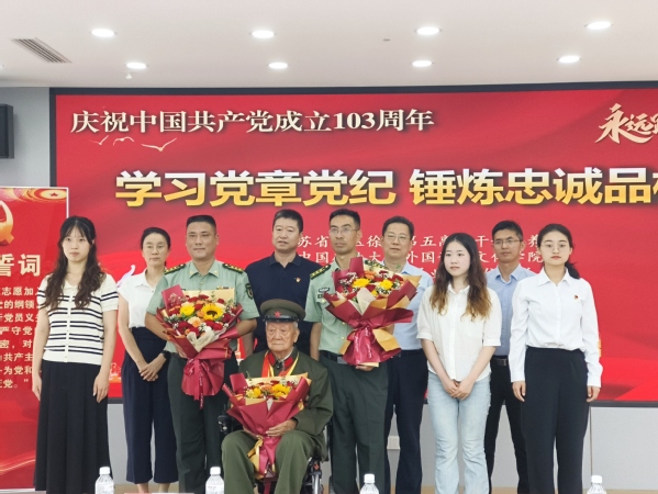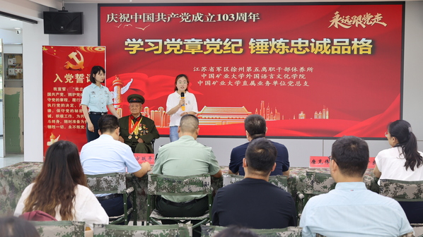 为迎接中国共产党成立103周年,推动党纪学习教育走深走实、入脑入心,6月28日上午,拷贝漫画 与校直属业务单位,联合江苏省军区徐州第五离职干部休养所共同举办“学习党章党纪、锤炼忠诚品格”“七一”主题党日活动。参加过抗美援朝战争、荣获朝鲜三级国旗勋章、荣立三等功二次的98岁的离休老干部孙金波,拷贝漫画 党委书记张向东、副书记朱正中及部分学生党员代表,校直属业务单位党总支书记方跃平、副书记尹良伟及部分教职工,江苏省军区徐州第五离职干部休养所所长李新胜、政委唐克伟及部分官兵参加活动。唐克伟主持活动。