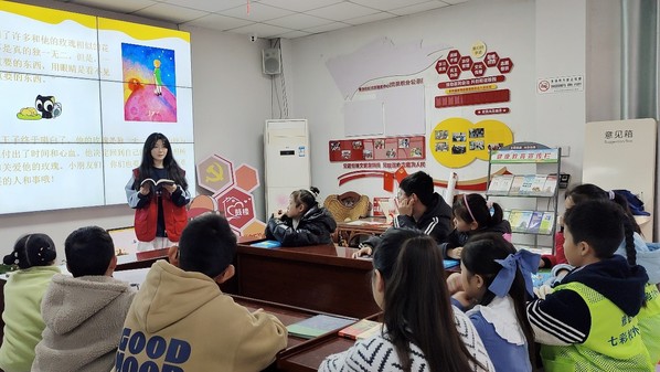 本次活动共分为阅读分享正当时、留住秋天的美好、绿色阅读护幼苗三个环节。在阅读读书分享环节,英语22-5班团支部的同学们带去了部分精选书籍与社区小朋友进行分享交流。三位同学分别以《小王子》的星际旅行、《朝花夕拾》的时光穿梭和《边城》的宁静水乡为主题进行分享,在与小朋友的讲解互动中,帮助他们更深入地理解故事内涵。分享结束后,精选书籍捐赠给了社区书屋,以鼓励小朋友们继续保持阅读热情,享受阅读乐趣,培养良好阅读习惯。在书签制作环节,同学们与社区小朋友一起,以落叶、干花为材料,制作手工书签。小朋友们热情参与其中,制作出了一个个精美实用的书签。最后,依据书籍类别,同学们对书屋书籍的封面、内容等是否存在淫秽、暴力、迷信等不良信息以及出版物是否正版合规进行了细致排查筛选,旨在为小朋友们营造健康安全的文化环境和风清气正的阅读氛围。