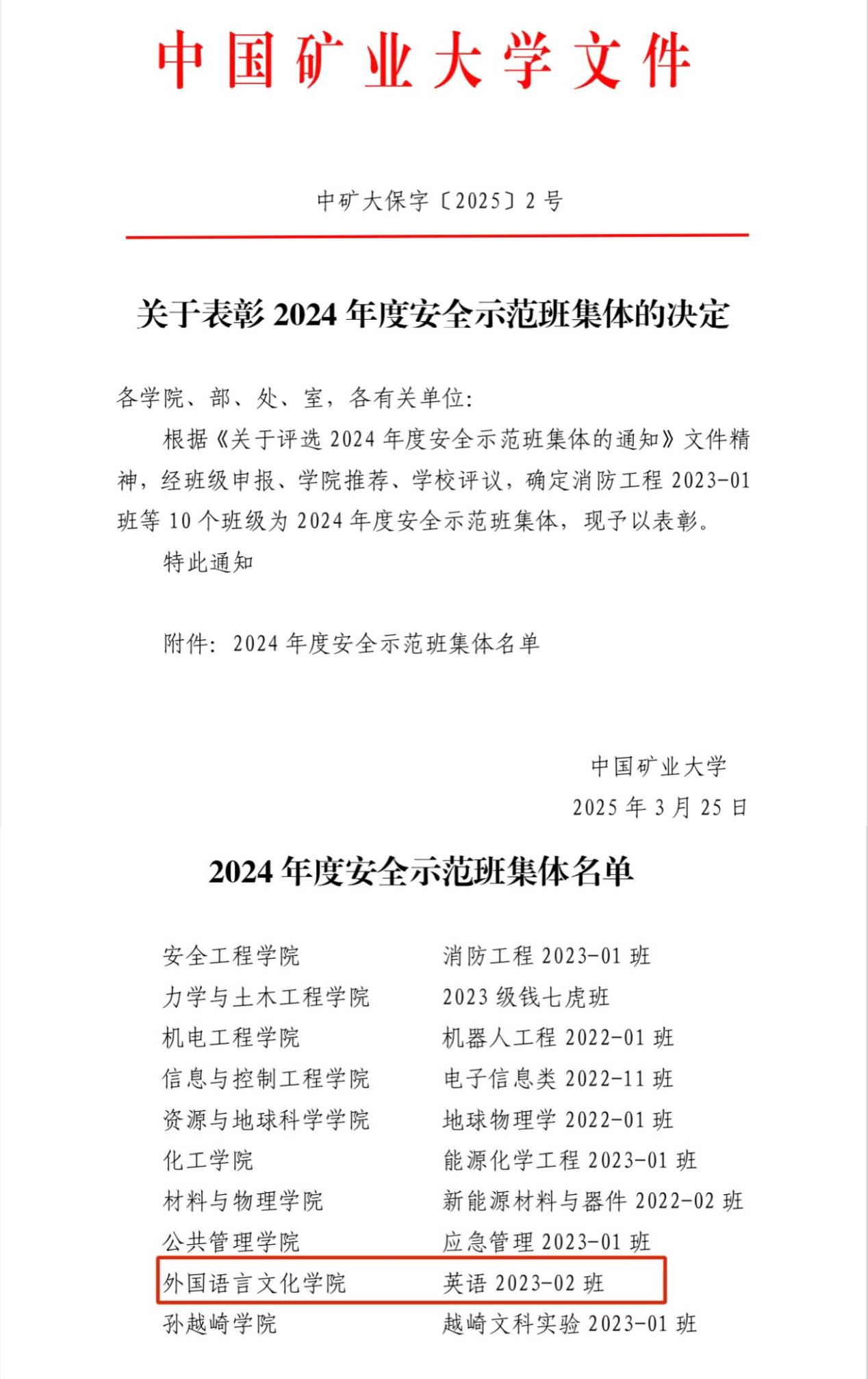 近日,学校公布了《关于表彰2024年度安全示范班集体的决定》文件,学院英语23-2班荣获“拷贝漫画 2024年度安全示范班集体”荣誉称号。这是学院连续第二年获此荣誉。