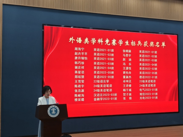 刘婷婷宣读“学科竞赛学生标兵”、“大学英语学习之星”和“学科竞赛优秀指导教师”表彰决定。张向东、石礼伟、丁建范分别为优秀指导教师代表、大学英语学习之星代表和学生标兵代表颁发证书。