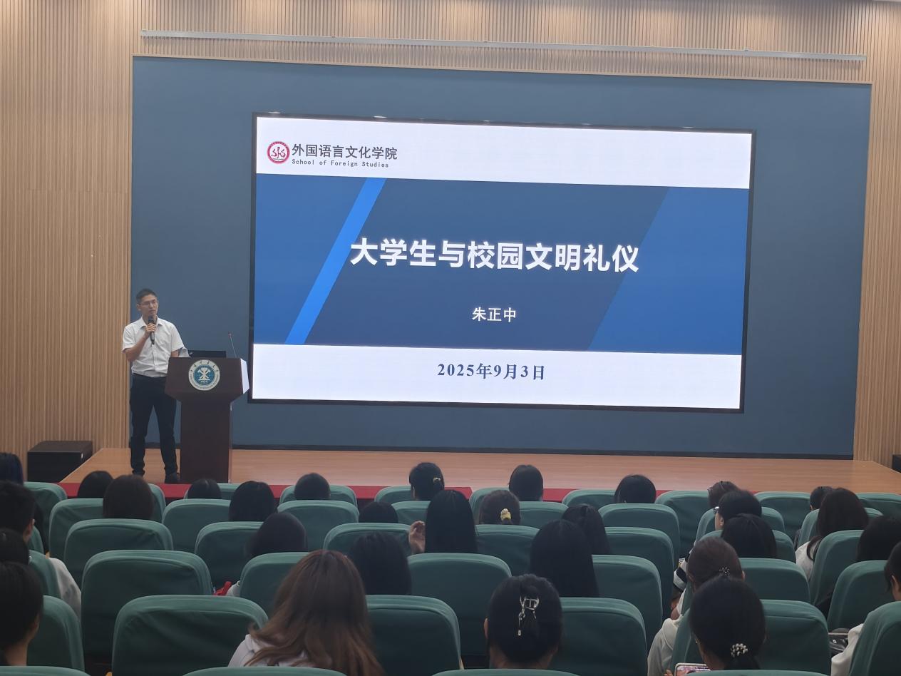 9月3日上午,拷贝漫画 在外文楼 B102 报告厅开展2025级新生入学文明礼仪及廉洁文化教育专题讲座。本次讲座由学院党委副书记朱正中主讲,辅导员付尚及全体2025级研究生、本科生共同参加。