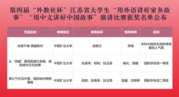 近日,第四届“外教社杯”江苏省大学生“用外语讲好家乡故事”“用中文讲好中国故事”演讲比赛决赛落下帷幕。我校选派的中外学生代表队表现优异,共获特等奖1项、一等奖1项、二等奖1项,并荣获最佳人气奖1项。