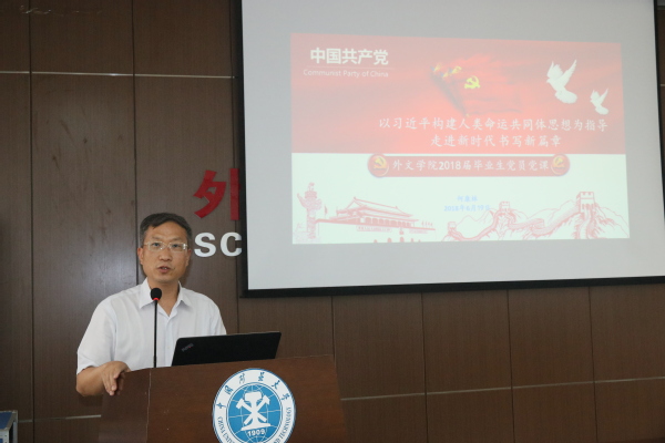 本次党课的主题为“构建人类命运共同体思想”,首先,何书记结合党的十八大、十九大向毕业生党员们介绍了推动构建人类命运共同体思想的背景和过程,指出面对充满挑战的世界局势,国际社会迫切需要打造人类命运共同体。接着,何书记从政治、安全、经济、文化、生态等多个方面阐释了构建人类命运共同体思想的内涵。随后,对于如何构建人类命运共同体这个问题,何书记指出中国要坚定奉行独立自主的和平外交政策,积极发展全球合作伙伴关系,在坚持对外开放基本国策的同时秉持共商共建共享的全球治理观,中国将继续发挥负责任大国的作用,不断贡献中国智慧和中国力量。同时何书记向毕业生党员们阐释了构建人类共同体的重大意义,构建人类命运共同体不仅为人类社会发展进步指明了方向、描绘了蓝图,同时丰富了党中央治国理政的理念和方略,增进了中国同世界的沟通合作。最后,何书记指出作为外语学生更应进一步认识中国共产党的伟大,坚定“四个自信”,践行构建人类命运共同体理念,增强使命感,充分发挥自身的外语专业优势,为构建人类命运共同体贡献自己的一份力量。同时,何书记告诫同学们以后要更加严格要求自己,继续加强理论学习,充分发挥党员的先锋模范作用。