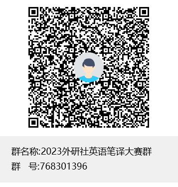 请同学们登录大赛官网(//ucc.fltrp.com)“选手报名/参赛”页面进行报名。请报名参赛的同学们务必加入QQ群(群号768301396,群名:2023外研社英语笔译大赛群),关注群内的比赛通知。不加入QQ群的同学错过重要群通知,导致无法参赛,责任自负。