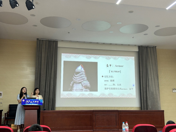 活动伊始,志愿者们为每个孩子提供了单词手卡,帮助孩子们在游览中记忆,在记忆中感受。在汉兵马俑博物馆中,讲解员带大家领略汉朝的军事风采,兵士俑们姿态各异、栩栩如生,正威严列阵、似蓄势待发。在活动体验区,小学生们体验了投壶、射箭的装备,让孩子们体验了一把“君子之艺”。临湖廊榭蔓回曲折,一面临景另一面置汉画石,石画线条刀刻斧凿,深深浅浅,明暗交织,诉说只有时光能听懂的故事。在汉文化大讲堂,汉学老师向大家普及了汉代礼仪知识,孩子们向老师行天揖礼,老师回土揖礼,一来一往,牵连起情谊,交织成传承的信念。随后,志愿者代表通过“词根/词缀+联想”记忆法,向孩子们讲解了汉文化相关英语词汇,引导孩子们将单词放入一定的语言环境,结合句意,高效记忆英语词汇。在参观过程中,志愿者们也同时采集景区不规范的标识翻译,以期规范徐州汉文化景区的标识翻译。